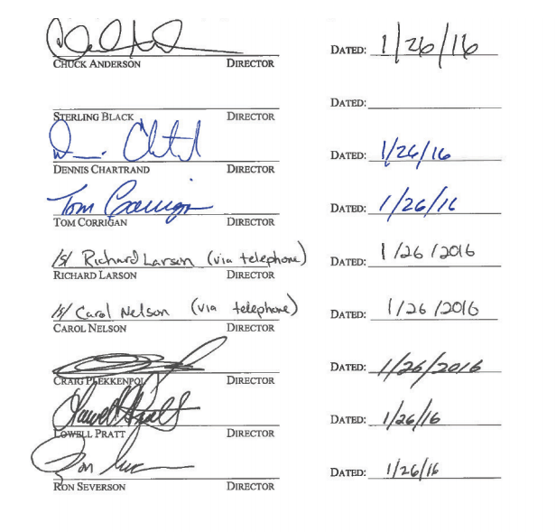 WHEREAS, on January, 26, 2016 the following members of the board of directors participated in a special meeting of the Board of Directors, called specifically to address the amendment of the TBG Bylaws; and