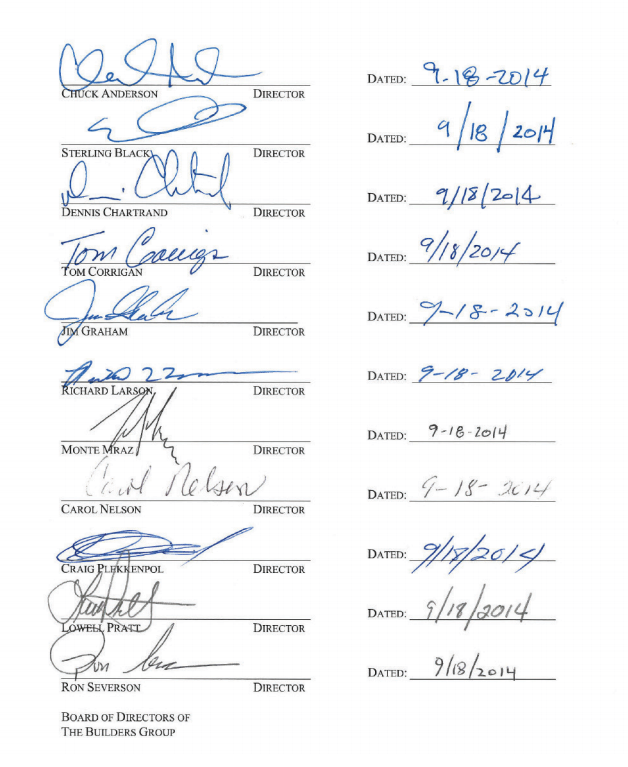 WHEREAS, on August 15, 2014, pursuant to Minnesota Statutes § §79A.19 et seq.; 176.181, subd. 2 and Minnesota Rules Revised, Chapter 2780, the Board of Directors of The Builders Group adopted The Builders Group Commercial Self Insurance Group Amended and Restated Bylaws (the “TBG Bylaws”); and